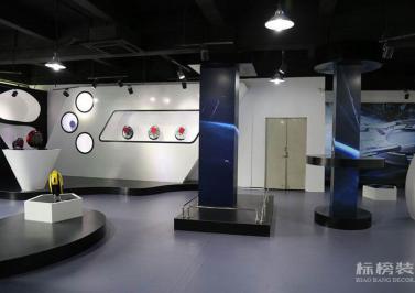 展廳設計以藍色為主色調:前廳有天花吊頂造型,以石膏板和天花軟膜為主。展廳頂面裸頂掃黑色乳膠漆再加上一些鋁方通,多邊形燈膜